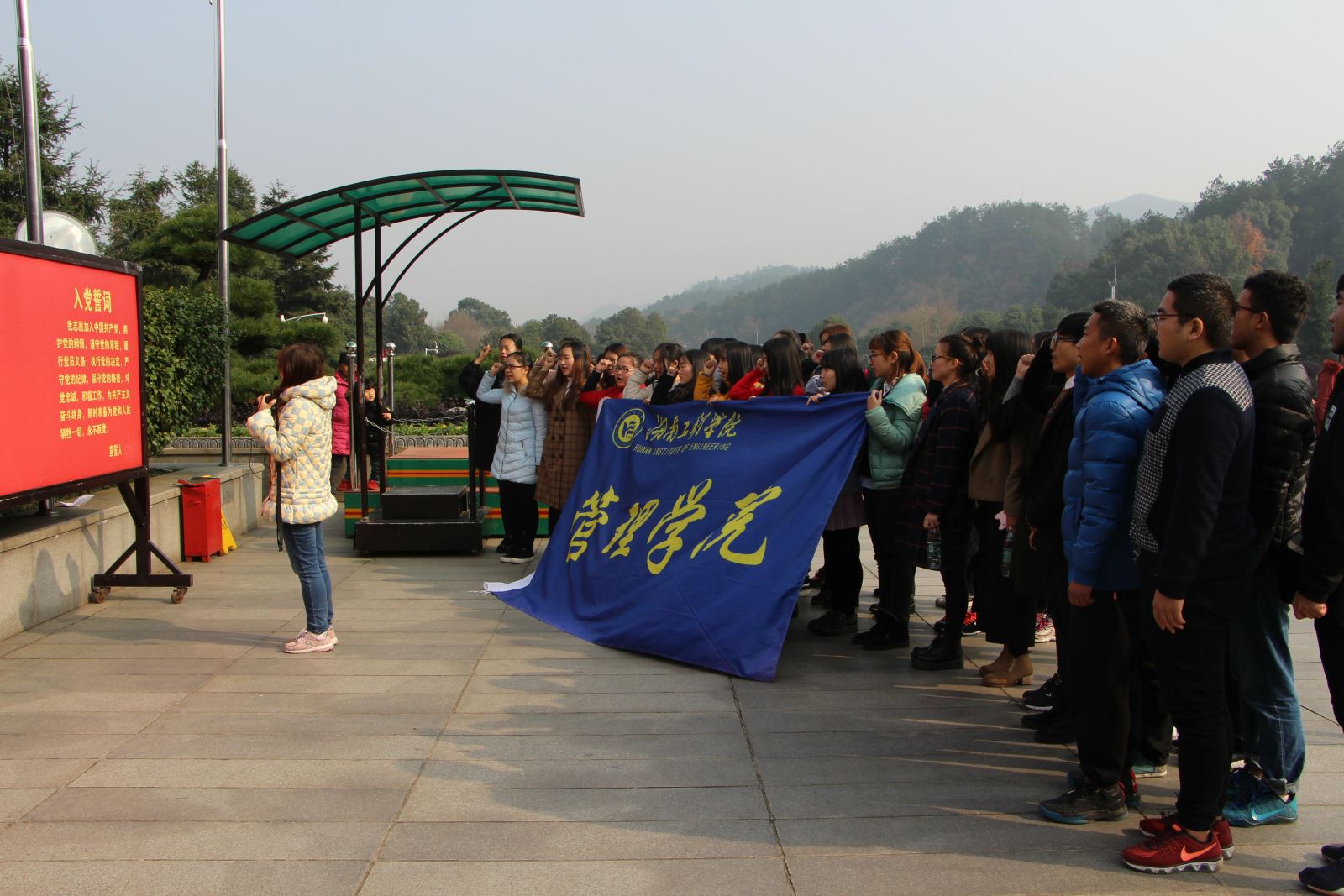 来到毛泽东铜像广场,面对鲜红党旗,各党员举起右手重温了入党誓词!党员们同志们齐声宣誓道:“我志愿加入中国共产党,拥护党的纲领,遵守党的章程,履行党员义务,执行党的决定,严守党的纪律,保守党的秘密,对党忠诚,积极工作,为共产主义奋斗终身,随时准备为党和人民牺牲一切,永不叛党。”它激励党员在今后的工作中以更高的标准来严格要求自己,勤奋刻苦学习,加倍努力工作,全心全意地为群众服务。