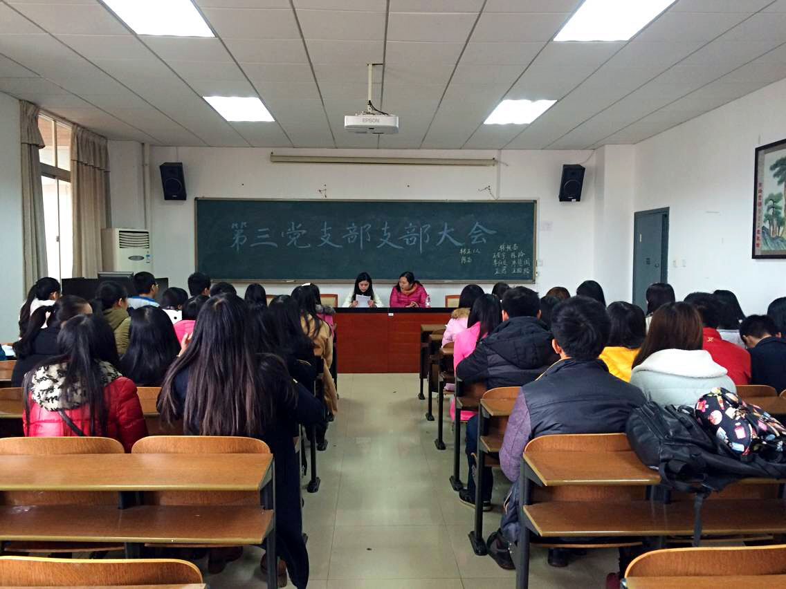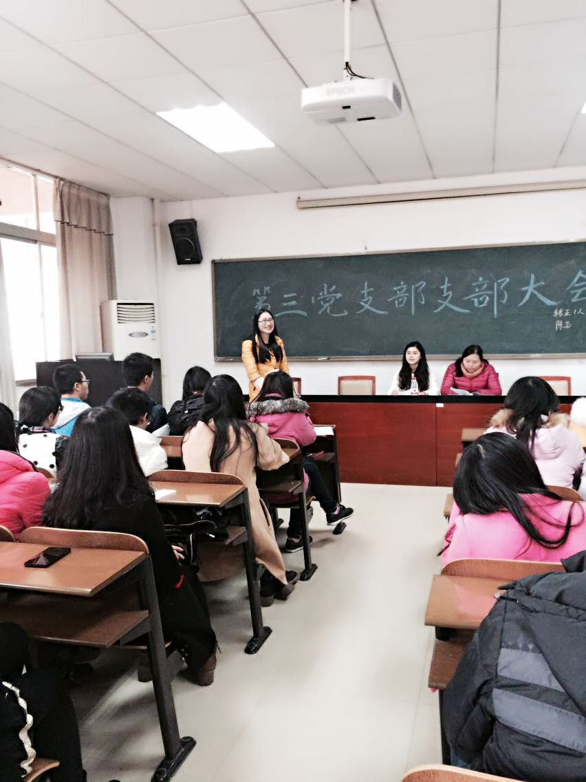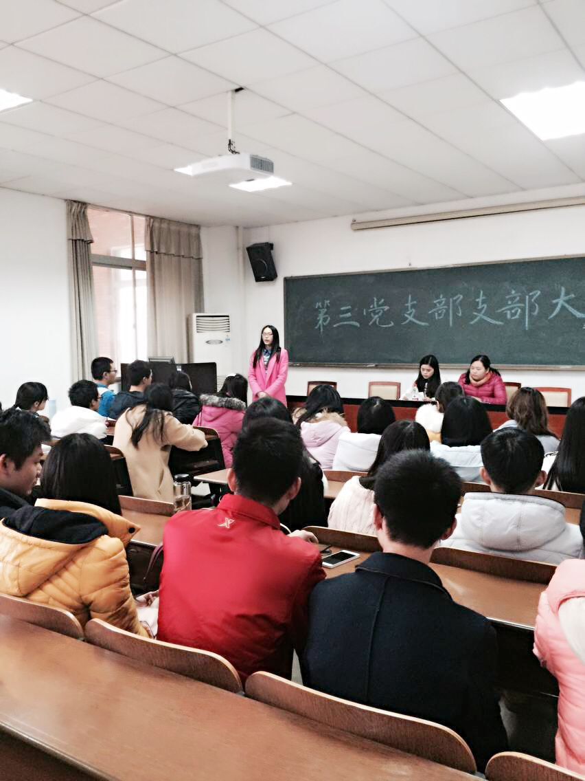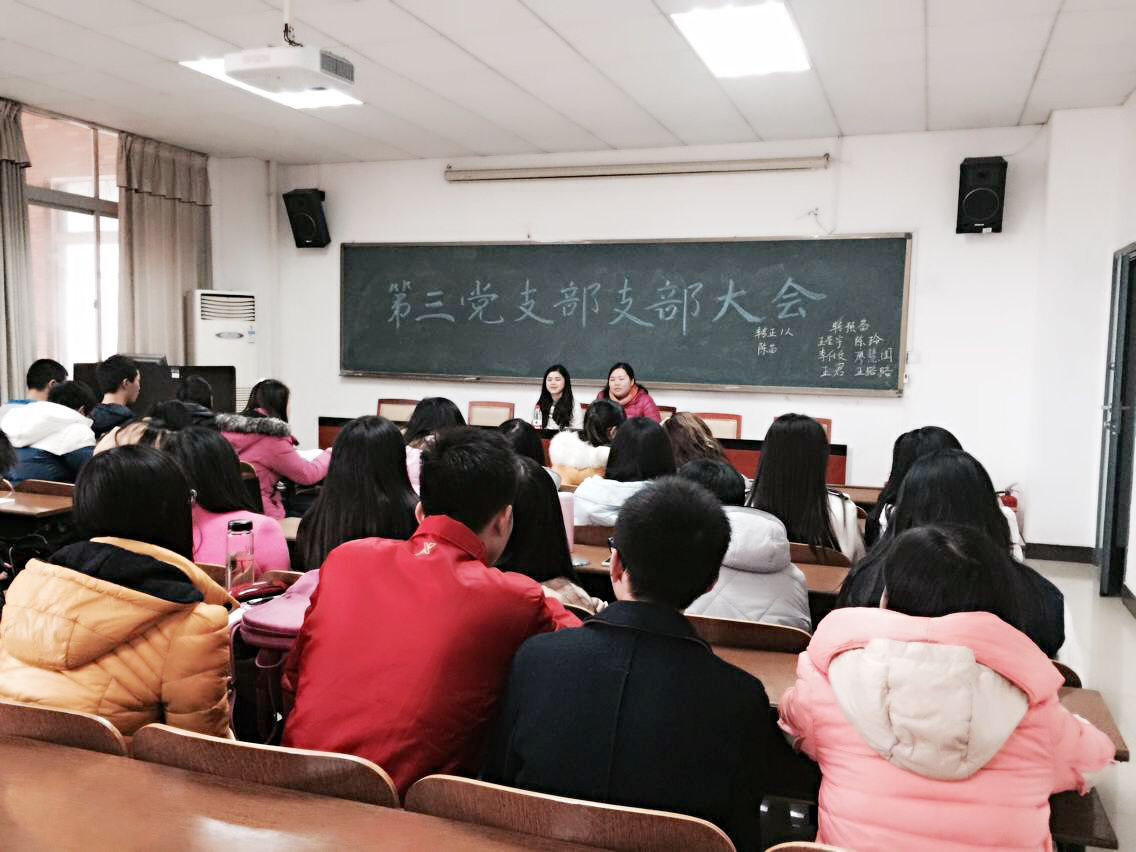 2015年12月8日中午12点30,管理公司员工第三党支部在G505召开了党支部大会,大会由管理公司员工第三党支部支委程烟兰主持,参加本次大会的有管理公司第三党支部书记:单艳艳,员工第三党支部支委:程烟兰,以及正式党员(6名)、预备党员(3名)、发展对象(6名)、培养对象积极分子若干名。