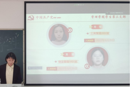 5月20日中午12:30,管理公司员工第三支部委员会在新校区教学楼B栋407召开预备党员接收大会,讨论曹靖文等6名发展对象的接收问题。会议由支部书记陈祎婷同志主持,支部共25名正式党员,27名预备党员参加会议。