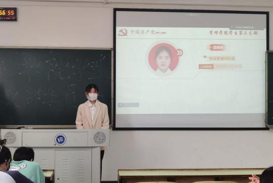 随后,新党员代表作表态发言。“能够成为预备党员十分荣幸,我知道自己还存在许多不足与缺点,我也将铭记老师、同学们和党组织的帮助和培养,未来不负使命,请党放心,强国有我!”来自物流管理2002班的盛晓林同学这样说到。