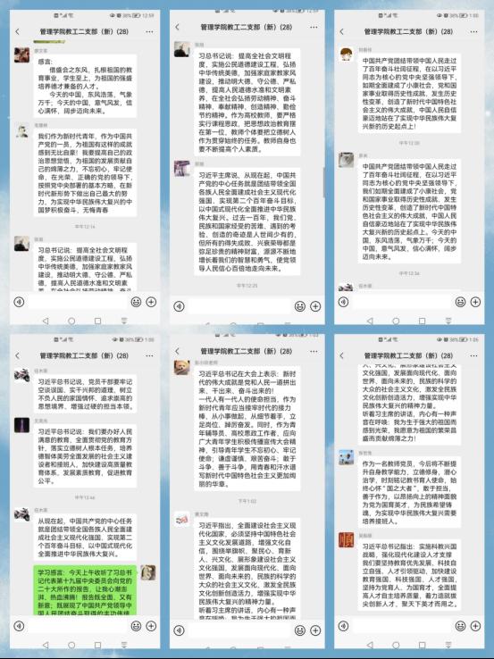 考虑疫情原因,本次主题党日活动采取较为灵活的教师党员通过在家通过电视、新媒体平台等自行收听收看方式,并通过在支部党员微信群分享习近平代表第十九届中央委员会向党的二十大所作报告的学习心得。