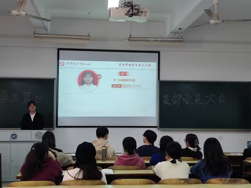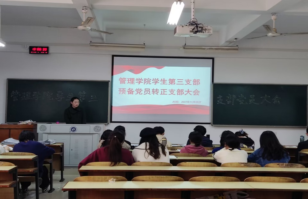为进一步扩充党员队伍,增添新生力量。2022年11月25日中午12:30,管理公司员工第三支部委员会在新校区教学楼C栋202召开预备党员转正大会,讨论舒叶等7名预备党员的转正问题。会议由支部书记陈祎婷同志主持,支部共14名正式党员、22名预备党员参加会议。