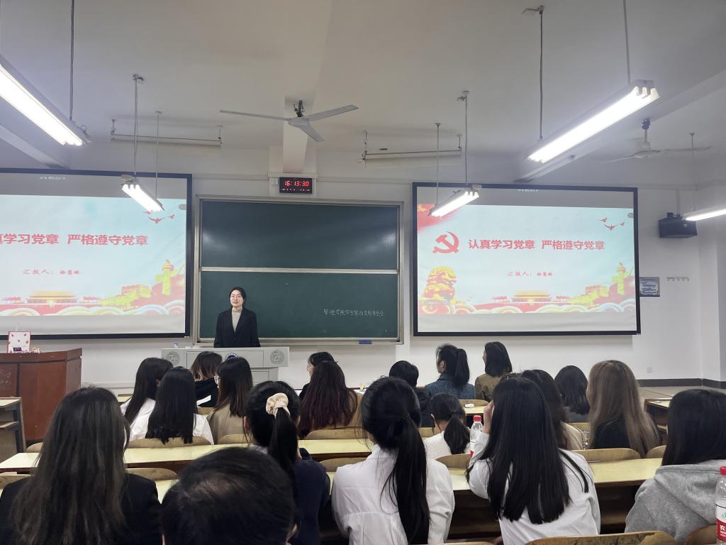 徐慧琳上台讲道,党章是党的总章程,是党的根本大法,是全党必须遵循的总规矩。党员需时刻牢记党章,扎实基本功,做到经住考验、耐住诱惑、守住本色,切实做到为党分忧、为国尽责、为民奉献。她提到,在平时的学习生活当中,对照党章找差距、明方向的习惯,让她深刻体会到约束的重要性。党章作为人生之镜子,照出她的错误,也照亮了她的人生道路。