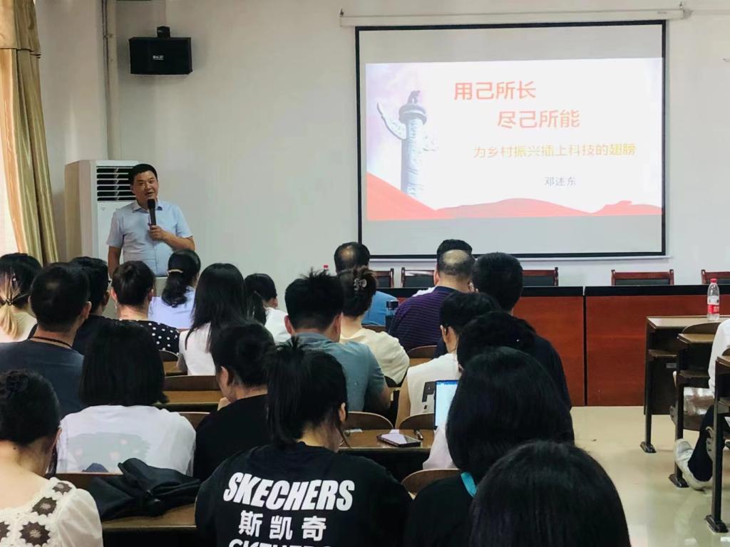 6月13日下午,管理公司在G505会议室举行主题教育“以学增智”专题学习与研讨会,会议由管理公司党委书记余博主持,管理公司教工党员和员工党员、入党积极分子80余人参会。中国好人、全国脱贫攻坚先进个人、湖南省人大代表、湘潭县射埠镇科协主席邓述东受邀为管理公司师生讲述“深耕一亩田”的故事。
