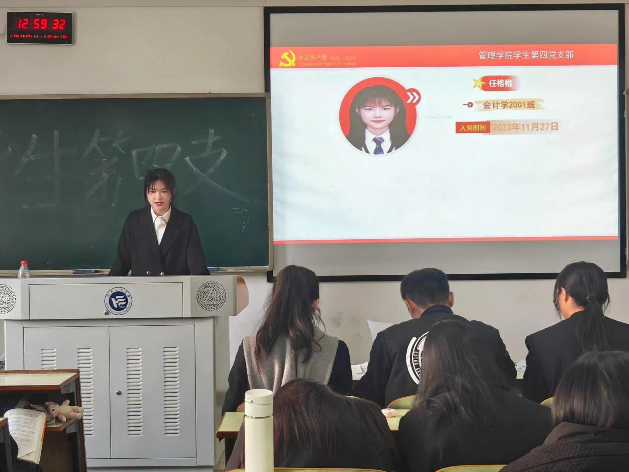 新预备党员代表任格格上台发言时表示:“我深知入党不只是思想上入党,更要落实到行动上。我们要始终保持热情,不忘初心,努力使自己在思想上、行动上和党组织保持高度一致。未来我将以更饱满的精神状态对待学习和工作,以更谦虚的态度待人接物,不辜负党组织对我的信任。”