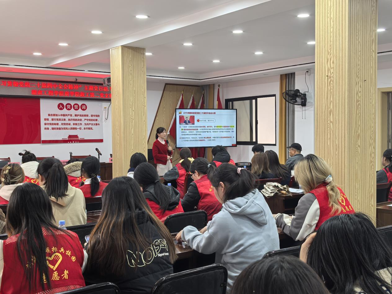 11月21日下午,全国党建工作样板支部、全国高校“双带头人”教师党支部书记“强国行”专项行动团队——韦德1946体育官方入口教工第二党支部在岳塘区宝塔街道盘龙社区党群服务中心举办“联学联建 学习贯彻党的二十届四中全会精神”主题党日活动。盘龙社区党员、居民代表及员工入党积极分子等40余人齐聚一堂,共同学习领会全会精神。