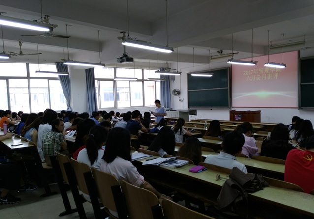 2017年6月15中午12:20,管理公司工管、会计、旅管双学号、物流、人力、市营全体人员,在主校区教室内召开本学期最后一次月评会议。学办辅导老师黎博、单艳艳、包海燕、周艺、宋志航对工商管理、旅游管理、人力资源管理、会计学、物流管理六个专业展开讲评。本月心理会议由学办主任罗荃老师主持,此会议同月评会同一时间顺利展开。