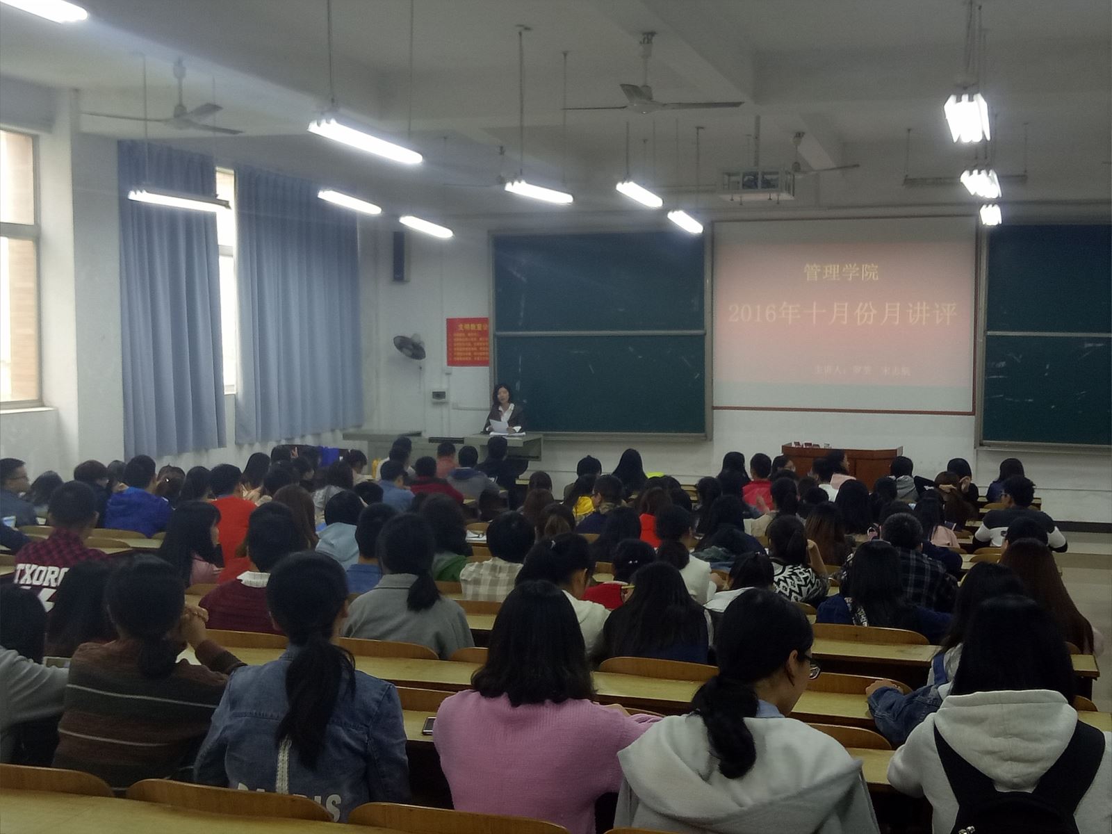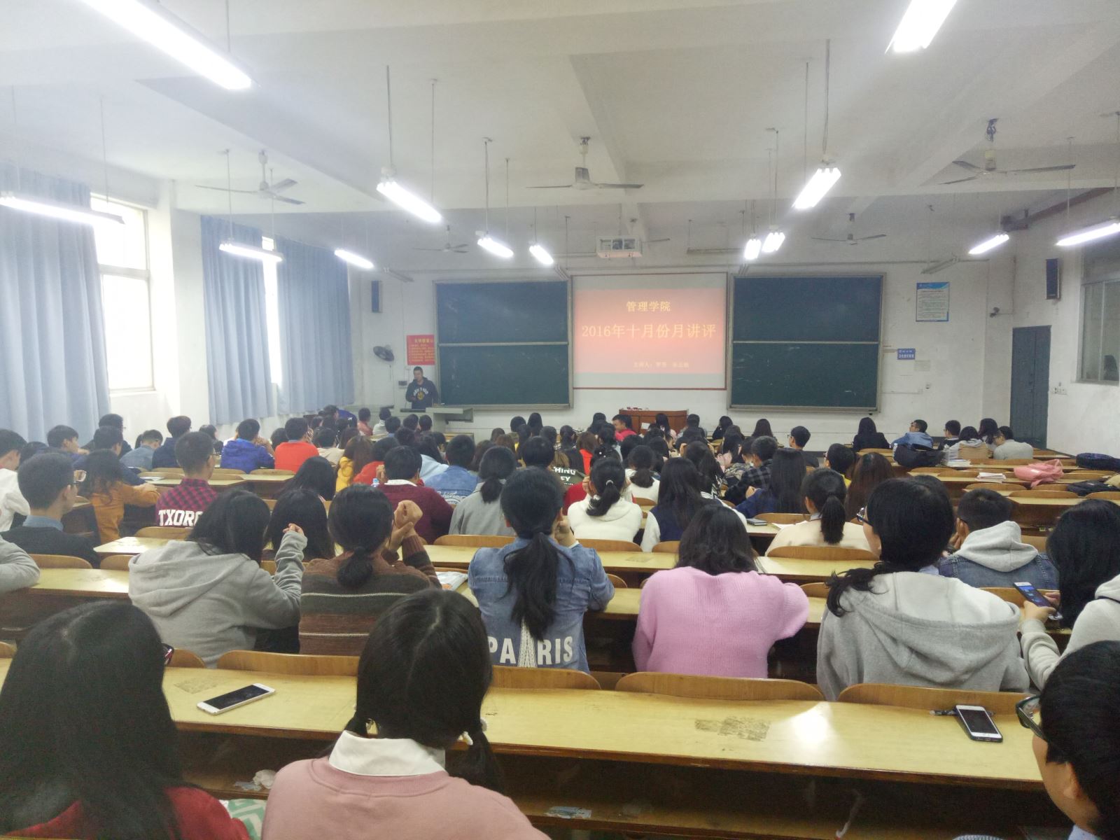 2016年10月27日中午12:30管理公司各班班长、学习委员、团支书、主席团、部长团等在主校区D101教室进本次月评会议。管理公司党总支书记钱祖煜主持,学办辅导老师罗荃、宋志航主讲本月讲评。