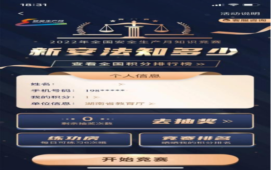 2022年6月是第21个全国“安全生产月”,为增强全民安全意识,提高师生安全素养,管理公司积极组织师生员工学习新修订的《安全生产法》,并参加全国“新安法知多少” 网络知识竞赛活动,公司领导班子成员、全体辅导员、教职工模范带头,积极动员全体员工参与活动,学习安全知识。