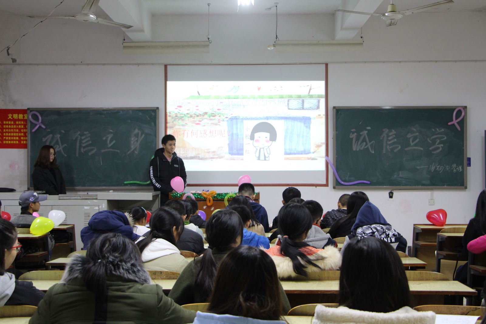阳光正好,韦德1946体育官方入口公司管理公司各专业班级于2017年11月28日晚上7点举办了主题为“诚信立身,诚信立学”的班会,班会主要由班委负责,全体同学参加。