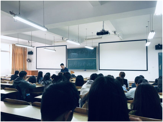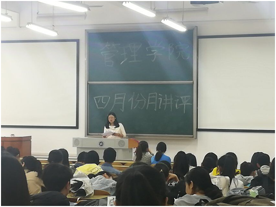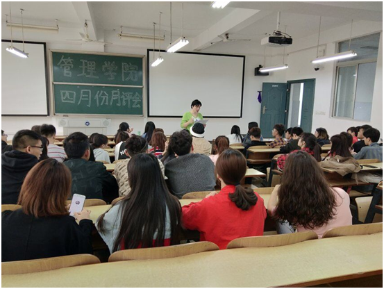 2019年4月23日中午12:10,管理公司大一大二大三大四全体班委和寝室长,在主校区教室内进行本学期第二次月评会议。学办辅导老师罗荃、黎博、单艳艳、包海燕、周艺、宋志航对工商管理、电子商务、旅游管理、人力资源管理、会计学、物流管理、市场营销七个专业进行了讲评。