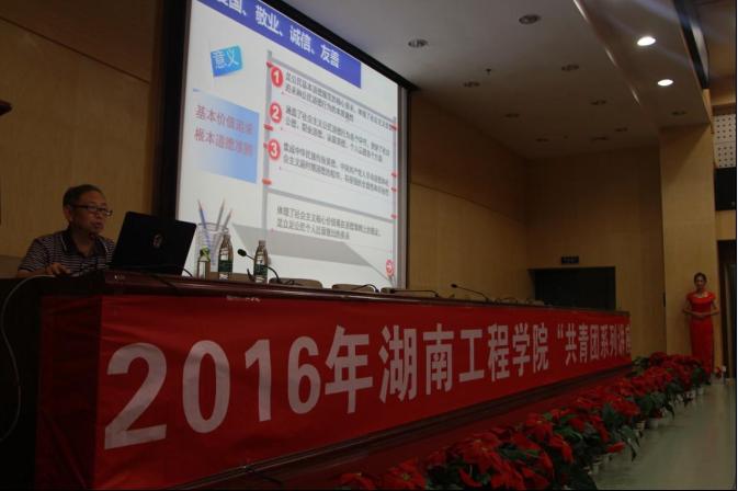 2016年10月20日,管理公司在图书馆第二报告厅开展了主题为“培育和践行社会主义核心价值观”的共青团系列讲座,此次讲座邀请的主讲人为前人文社科系主任朱登武教授。