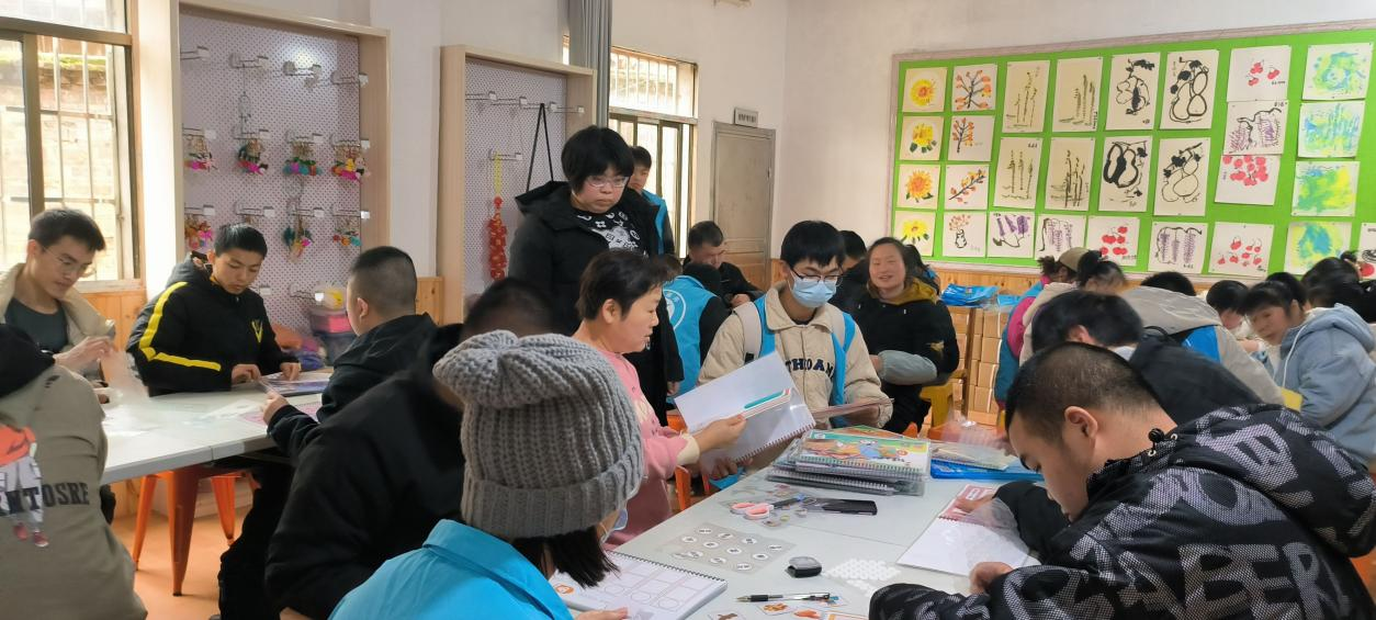 志愿者们微笑着感谢他们,在这一个小小的房间里充满了温暖。在园长安排完活动任务后,大家都干劲十足,志愿者们与亲园残障人们组好小队。开始今天的主要任务——粘贴绘本。志愿者的主要任务是教残障人如何粘贴好绘本,他们手把手的教他们应该贴在哪里,以及如何贴好。让残障人士们有一技之长是解决根本问题之一。
