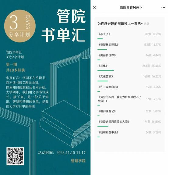15日,管理公司在“管院青春风采”微信公众号开展了一期“管院书单汇”书籍投票活动,共发布十余本书籍。在同学们的积极参与下,经过为期三天的票选,刘慈欣的《三体》、韦娜的《我爱这星河滚烫的人间》、余秋雨的《文化苦旅》、霍达的《穆斯林的葬礼》、安托万·德·圣-埃克苏佩里的《小王子》成为2023年秋季学期管理公司最受欢迎书单。今后,管理公司将持续开展“管院书单汇”书籍投票活动,让更多的书籍走进同学们的学习生活中,进一步提升同学们的自身的阅读能力和思考能力。
