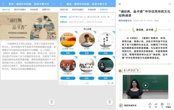 在公司易班管理中心和各班班委的积极发动下,各班同学积极响应,认真选择经典书籍进行朗诵视频拍摄。在收到的视频中,经典的篇章如美妙的乐章在空气中回荡,《论语》的智慧、《诗经》的风雅、唐诗宋词的韵味,一一展现在众人面前,同学们用自己的方式诠释着经典的魅力,让这些古老的文字焕发出新的活力。从收到的视频作品筛选出优秀作品放至易班平台进行展示、投票。还通过公司微信公众号“管院青春风采”进行宣传和推广,不仅收获了师生们的一致好评,同学们目睹文化盛宴,师生好评如潮。物流管理2101班王震宇同学在欣赏完相关作品后感慨道:“我很自豪有如此优秀的传统文化供我们学习,以后我要向先辈们看齐,将中国优秀传统文化发扬光大!”最后,为期六天的投票结束,易班管理中心将投票结果进行公示,分别评出最受欢迎奖1项,最具表现奖5项,本次活动圆满落幕。