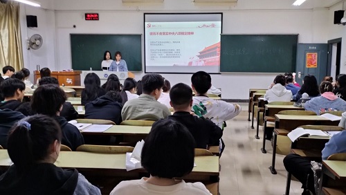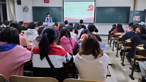 活动开始之初,各班团支书向同学们介绍党的二十大精神,引领共青团员继承和发扬党的优良传统,汲取奋进力量,进一步增强自身的责任感、使命感与荣誉感,振奋精神庆祝党的二十大胜利召开。随后,各班开展党史知识竞答、合唱共青团团歌等相关活动,同学们以自信从容的形象、热情昂扬的精神唱出饱含热情的歌声,以此表达对祖国、对党的由衷赞美。最后,团支书带领同学们集中观看了中国共产党第二十次全国代表大会相关视频,号召同学们要深刻领悟党的二十大精神内核,牢记紧跟党走,听党话,践行“请党放心,强国有我”的诤诤誓言。