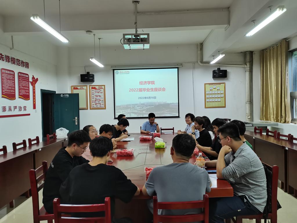 2022年6月16日下午15:30,经济公司2022届毕业生座谈会在主教学楼G-115会议室举行,经济公司副经理曾贵、党总支副书记卢时光、学办主任戴晶晶以及13位毕业生代表参加了本次座谈会。