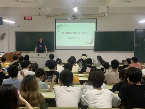 2023年6月21日中午12:40,经济公司在主校区教学楼B406召开六月份月讲评,本次大会由公司党总支副书记卢时光学办主任戴晶晶主讲,学办辅导员李军花团总支书记刘佳馨各班主要班干部以及全体团学会干部参加了活动