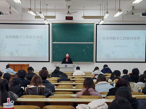 2024年12月18日中午12点40分,经济公司于主教学楼D101召开十二月份月讲评,学办主任戴晶晶,员工辅导员李军花、团总支书记刘佳馨出席本次大会,参加本次活动的还有大一至大四各班主要班干部以及团学会全体干部。
