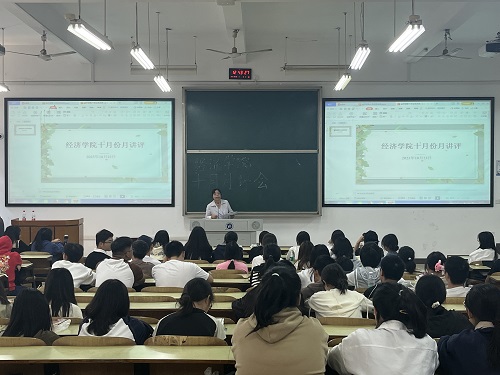 2023年10月23日中午12:30,经济公司在主教学楼D101和D102召开了十月份月讲评,学办主任戴晶晶、员工辅导员李军花和团总支书记刘佳馨出席本次大会,全体大一新生及团学会干部参加活动。
