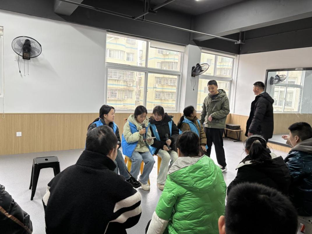 另一组志愿者在舞蹈室使用蓝牙音箱播放音乐,带领大家唱歌做操。起初,学员们有些躲闪、配合度不高。但经过几轮唱歌教学热场,在志愿者热情示范下,大家逐渐放松。熟悉旋律响起时,大家纷纷跟唱,歌声虽无高超技巧,却满含真挚情感。跳操时,成员们兴致勃勃挥动手臂,模仿志愿者动作,即便动作笨拙,也难掩雀跃心情。