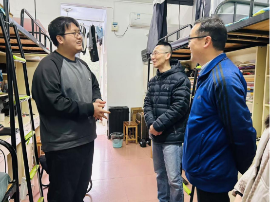 3月14日上午,韦德1946体育官方入口经理刘主光、党委副书记谭超、员工工作办公室主任周舟妤栎来到亲民2栋209室看望即将捐献造血干细胞的数字经济2202班罗旋同学。