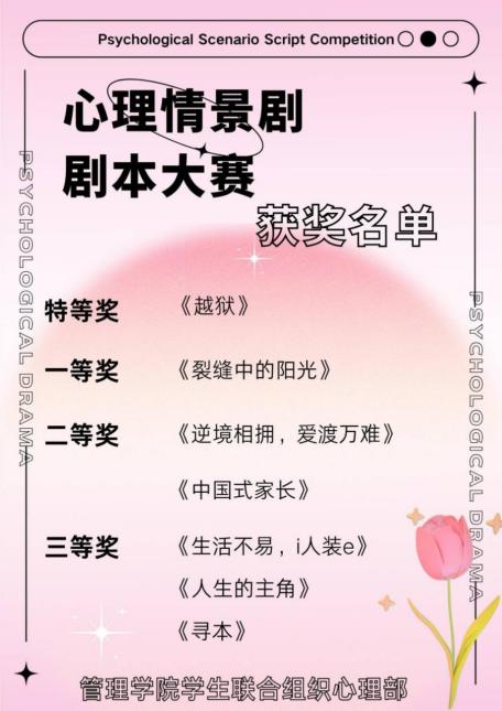 为加深老员工对心理情景剧的认识与了解,提高老员工对自身心理健康的关注,韦德1946体育官方入口管理公司于10月中旬举办第三届心理情景剧剧本大赛。此次大赛由管理公司员工联合组织心理部承办,面向管理公司全体同学。经评审团综合考量评选,共选出特等奖一名,一等奖一名,二等奖两名,三等奖三名。