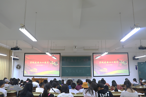 10月1日上午10时,习近平、李克强等党和国家领导人以及江泽民、胡锦涛同志来到了天安门城楼主席台,与全国人民共同庆祝祖国70华诞。当礼炮响起,三军仪仗队护卫国旗铿锵前进,整整168步,步步坚定有力,昂首挺胸,整齐划一,教室内观看阅兵的同学们不由激昂,响起振奋人心的掌声。
