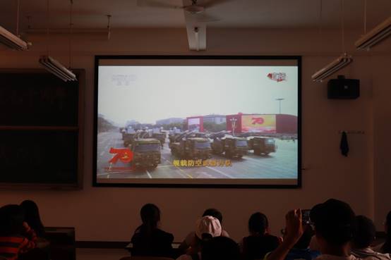 此次阅兵随着时间迎来一次又一次的高潮。如空中护旗梯队以20架直升飞机组成巨大的“70”字样、女民兵方针飒爽英姿五尺枪、100面战旗美如画、维和部队阔步而行、东风-41核导弹方队的惊艳亮相等,皆让同学们为之骄傲、热血沸腾。他们呐喊着、感慨着这盛世如周老所愿,山河犹在,国泰民安,将强兵富国进行到底!