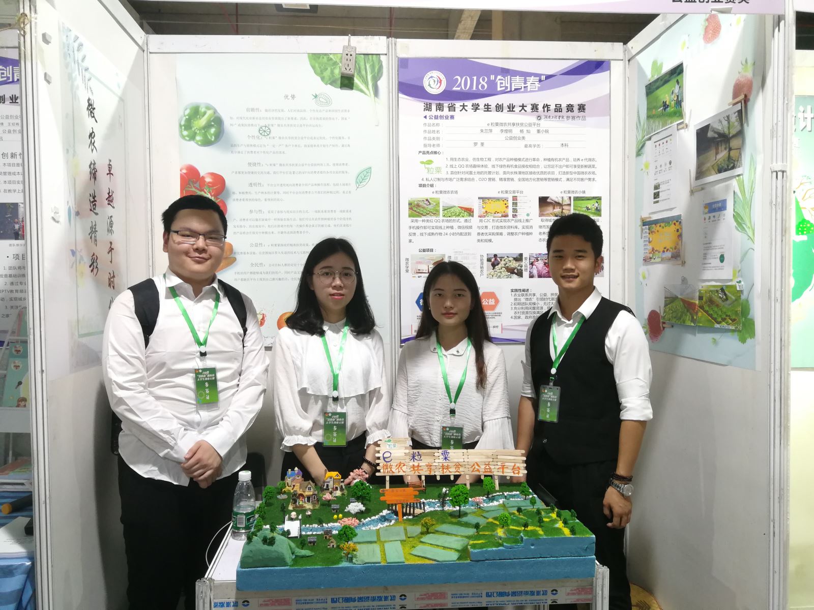 公司朱兰萍 李煌明 杨灿 董小锐的作品《“e粒粟”微农共享扶贫公益平台》(罗荃老师指导);辜佳豪 黄成 申家宁 严敏 沈静 《“源生”环保公益有限公司》(朱文明老师指导)经过公开展示、专家评审等比赛环节的激烈角逐,勇夺本次湖南省赛事的铜奖。