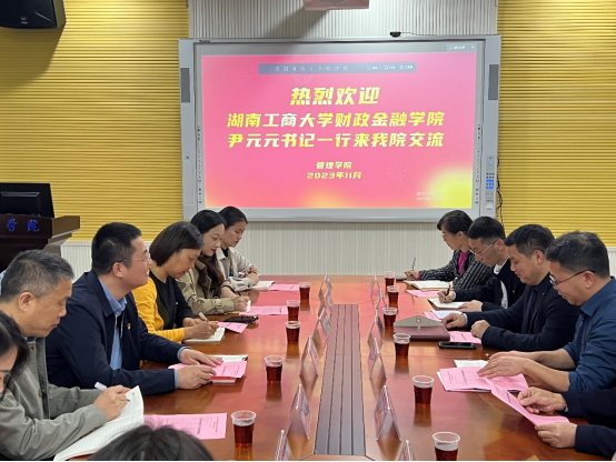 11月23日下午,湖南工商大学财政金融公司党委书记尹元元、党委副书记肖劲松一行10人来公司管理公司调研交流党建工作、员工管理工作。管理公司党委书记余博、经理徐运保、党委副书记谭超、各党支部书记参加交流会。