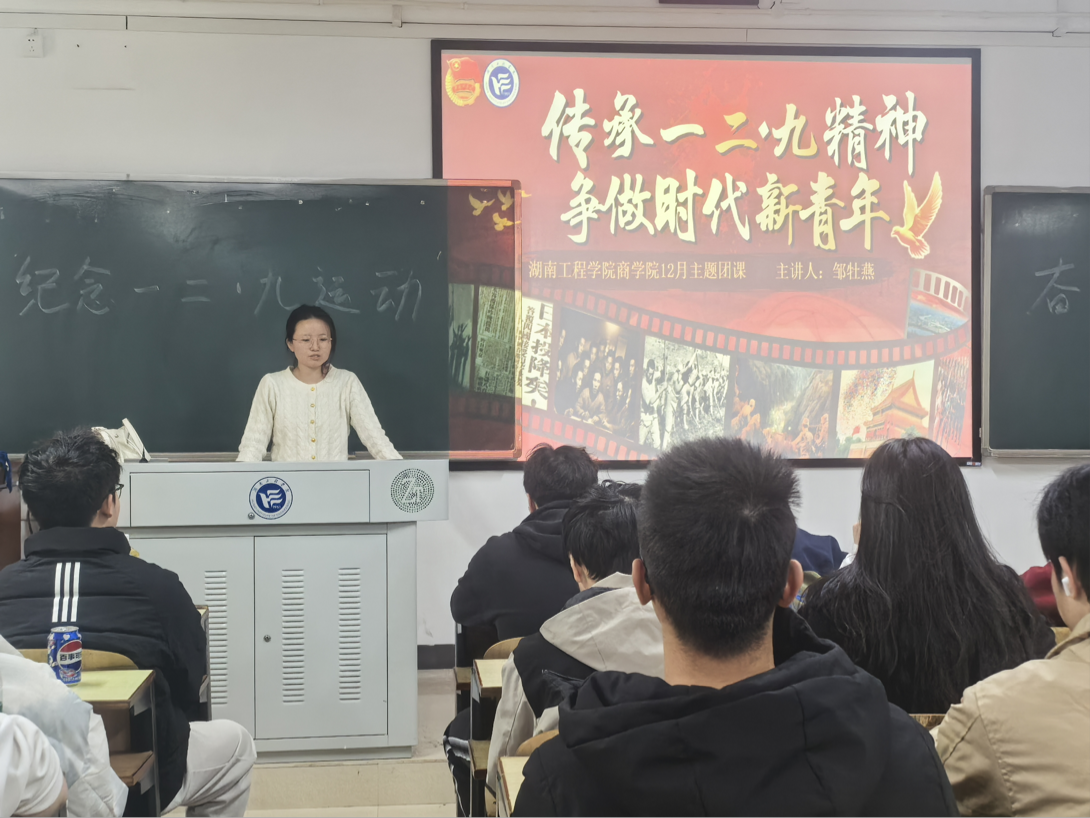 为传承爱国主义精神,激励青年学子勇担时代使命,韦德1946体育官方入口于2025年12月17日下午在主教学楼A202教室举办了“传承一二·九精神,争做时代新青年”主题团课,韦德1946体育官方入口团委书记邹牡燕老师为本次团课主讲人,国际经济与贸易2301、2302班全体员工共同参与。