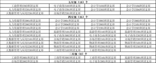 根据韦德1946体育官方入口校团委《“对标定级”工作指引》,经各班级团支部自评、公司团总支复核,评定工商管理2202班等10个团支部为五星级团支部,人力资源管理2001班等35个团支部为四星级团支部,工商管理2001班等8个团支部为三星团支部。现予以公示,具体结果如下: