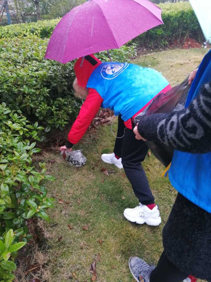 由于天气原因,此次的志愿活动开展的并不是很顺利,但是在寒冷的冬雨中服务社会却更展现出志愿者们坚忍不拔的意志。志愿者们互相配合,一人撑着伞,一人拾起地上的白色垃圾,槟榔渣,烟头,口香糖是志愿者们重点关照的“对象”,一蹲一起,足显二者之间的默契。