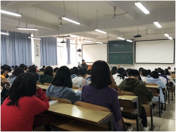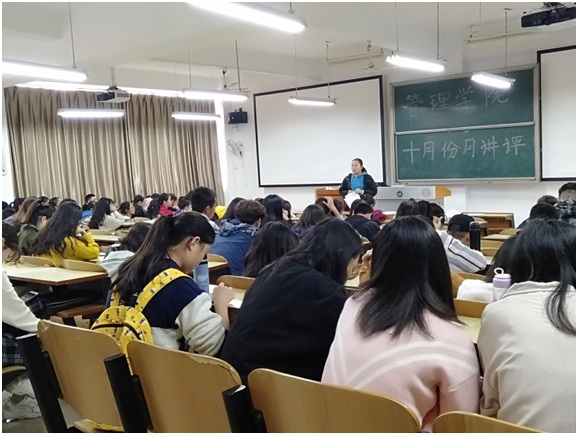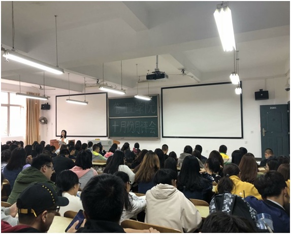 2018年10月25日中午,管理公司大一大二全体同学、大三大四全体班委,在主校区教室内进行本学期第二次月评会议。学办辅导老师罗荃、黎博、单艳艳、包海燕、周艺、宋志航分别对工商管理、电子商务、旅游管理、人力资源管理、会计学、物流管理、市场营销七个专业进行了讲评。