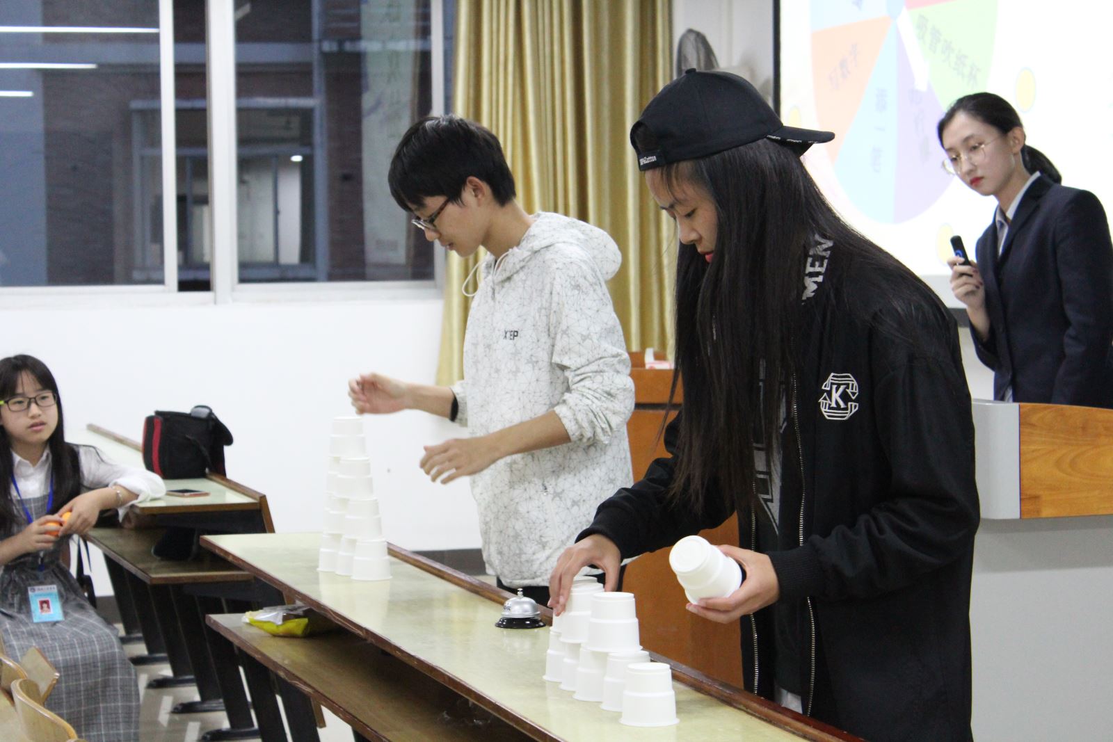 “超级班级”复赛共四个版块,分别为任务型抢答、班级答题接力赛、互动环节、难度挑战加分赛。首轮各班派代表猜拳决定挑战任务,任务完成抢先按铃者优先答题,答对计分,否则对方得分。叠杯子、吃柠檬、吹纸杯等8个趣味性的任务让同学们乐在其中,跃跃欲试。代表同学动作敏捷,反应迅速,为本班赢得了抢答优先权,点燃了赛场气氛。