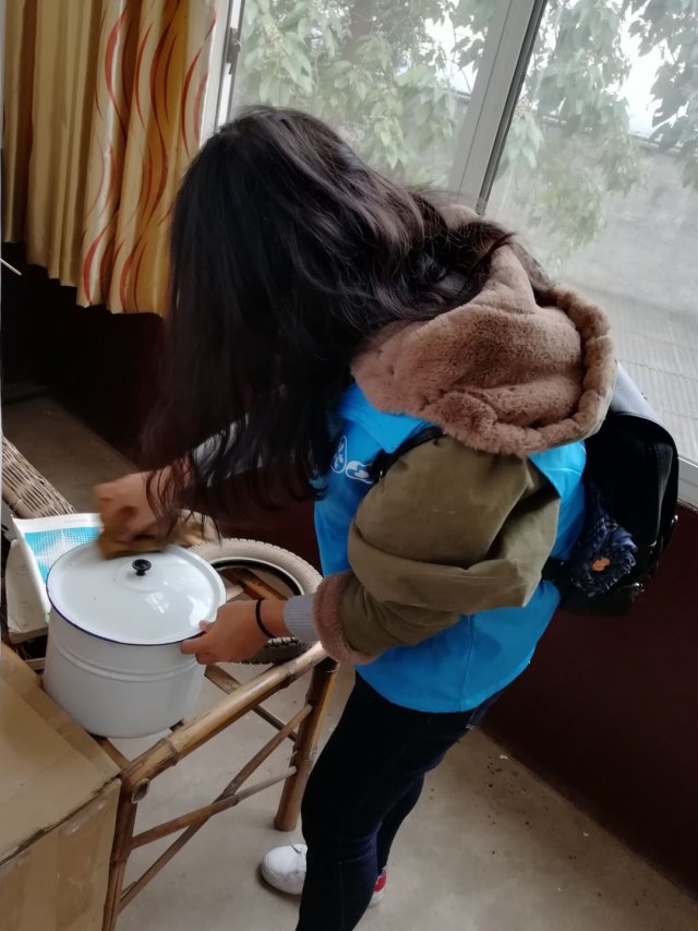 在板凳妈妈的家中,挂满了各种锦旗,让志愿者们心生敬意。就在这样一种敬佩的心情下,志愿者们打扫板着凳妈妈的家,擦窗户,打扫走道,收拾柴火。暖心的板凳妈妈交代志愿者们,天气冷用热水会好一点。天气虽冷,但板凳妈妈的话却温暖了每个志愿者的心。在板凳妈妈身上大家都体会到:虽然身体微瑕,也可以活的精彩。本周的志愿者活动不单单帮助了板凳妈妈,也使志愿者们体会和学习到了一种坚韧不拔和乐于助人的优秀品质。