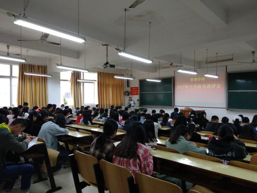 2017年10月25中午12:10,管理公司大二到大四工管、会计、旅管、物流、人力、市营全体双学号同学及大一全体同学在主校区教室内进行本学期第二次月评会议。学办辅导老师黎博、单艳艳、包海燕、宋志航对工管、旅管、人力、会计、物流、市营的六个专业进行讲评,本月心理会议也与月评会同一时间顺利展开,由罗荃老师主持,全体心理委员和寝室长参加了心理会议。