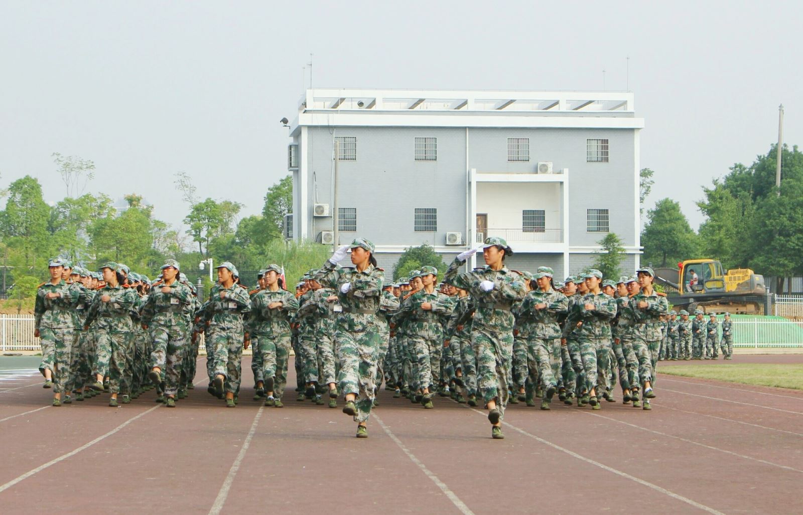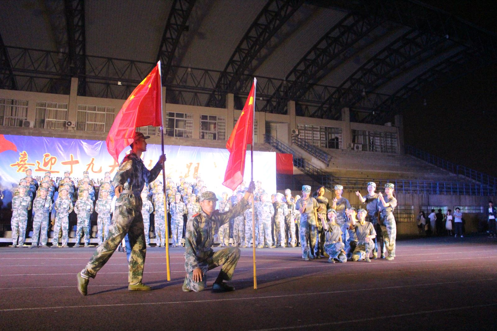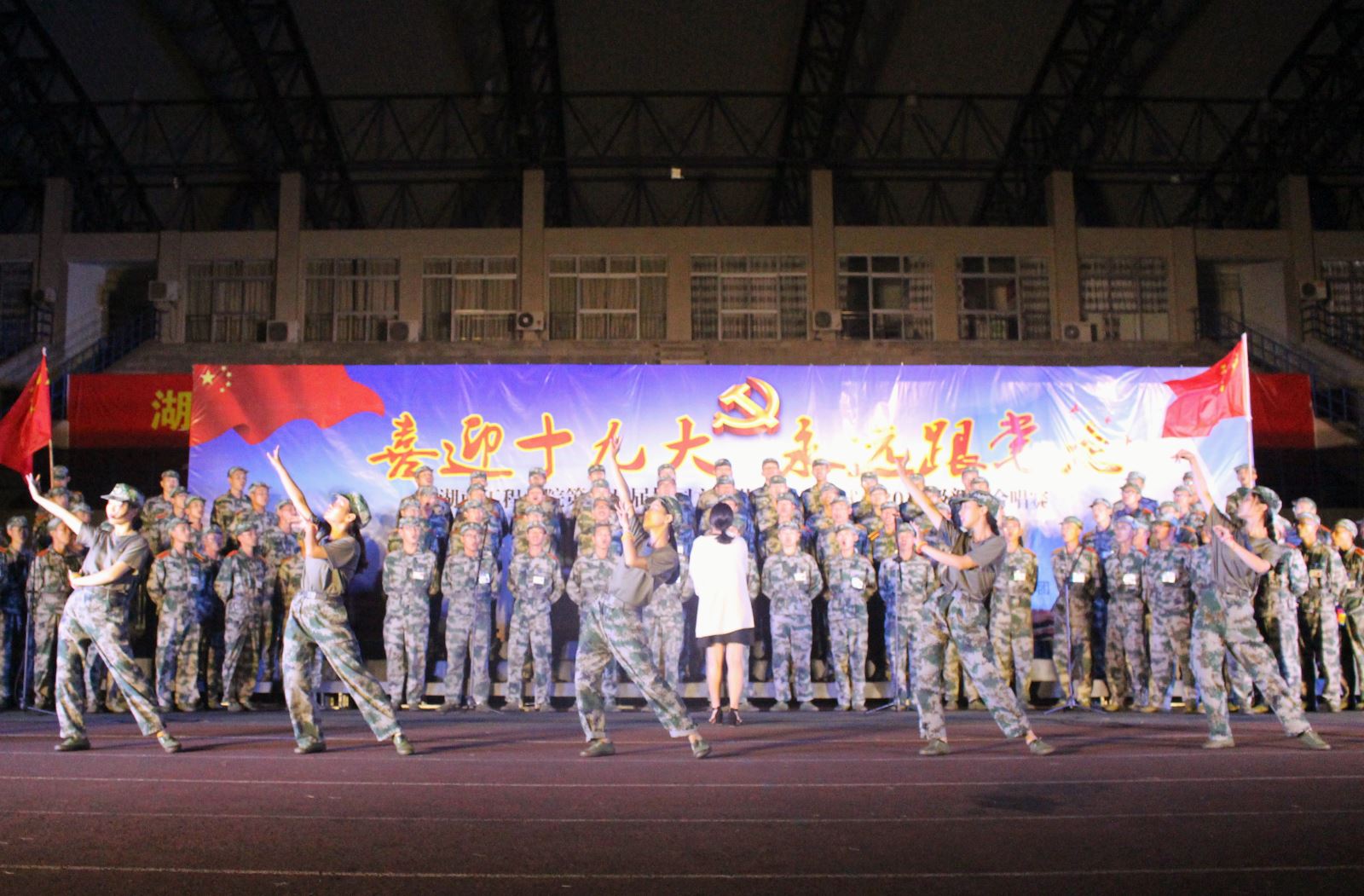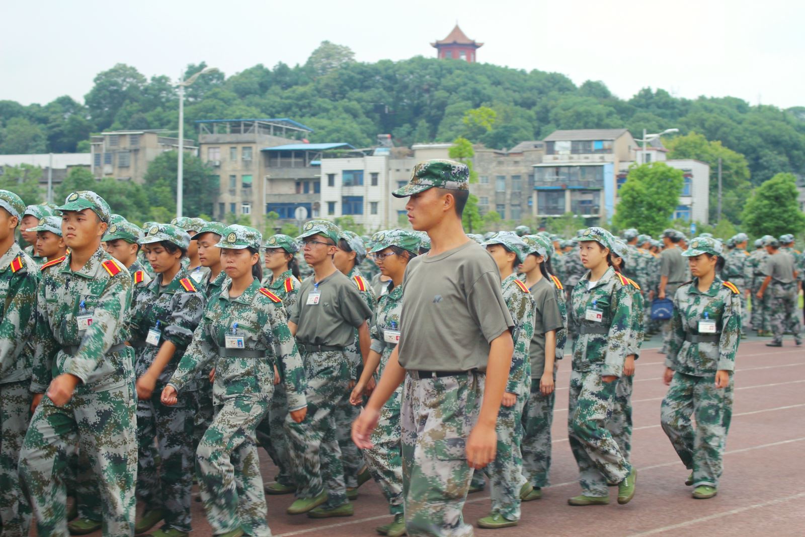 九月,骄阳似火,体育馆内,意气风发的精神面貌、整齐排列的队形展现在大家的面前,嘹亮的口号声和军歌声充斥在耳边。刚入学的2017级新生们穿着迷彩服,在烈日之下,一遍又一遍的重复着训练动作——齐步走、正步走。