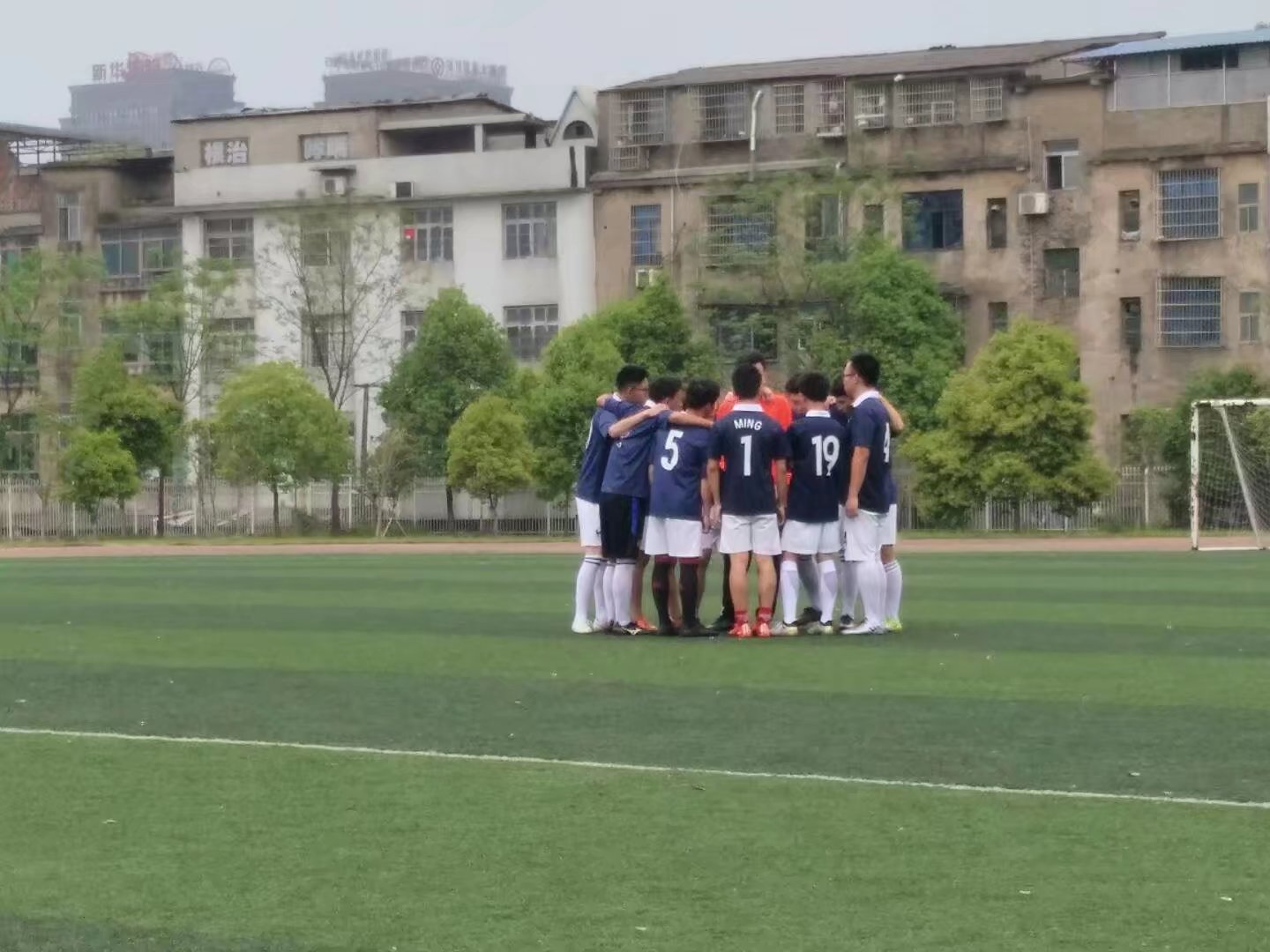 球场上,你追我赶,围追堵截,奋力争分,毫不退让。经管足球队9号队员接队友长传球,单刀直入晃过一名防守队员在禁区内成功射进一球,拿下本场比赛第一分。