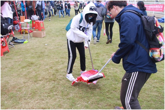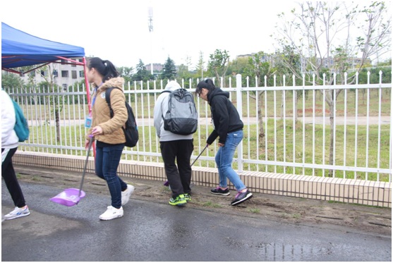 田径场内,管理公司蓝丝带联盟拿起扫帚和簸箕,围绕整个操场,清扫垃圾,为各公司分发垃圾袋,帮助保持运动场上的清洁。