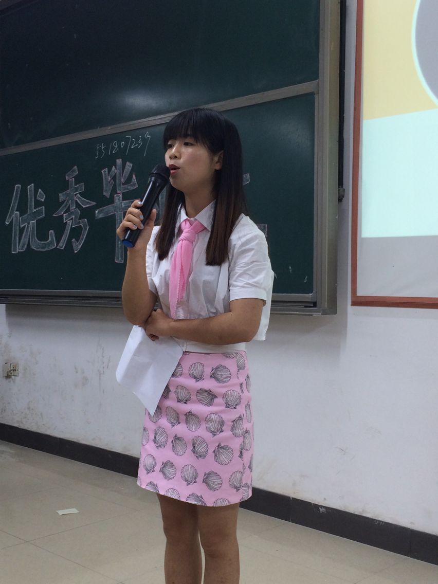 曾获得校演讲比赛团体亚军的会计1202班欧阳毓燕介绍了在演讲过程中的台风问题,气场气质和舞台表现力,并指出在演讲过程中能多加一些趣味性的言语,语句不拖沓,有重点,有独特例子,与观众互动,为给一场演讲增添不少风采。