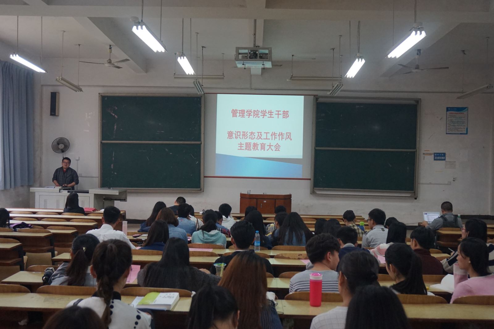 4月14日中午12点, 管理公司在主校区教学楼D101举办 “员工干部‘意识形态’及‘工作作风’主题教育”大会。公司党总支副书记钱祖煜、全体学办老师出席了此次会议,公司全体员工会干部及各班班长、团支书参加了此次大会,认真参加学习。