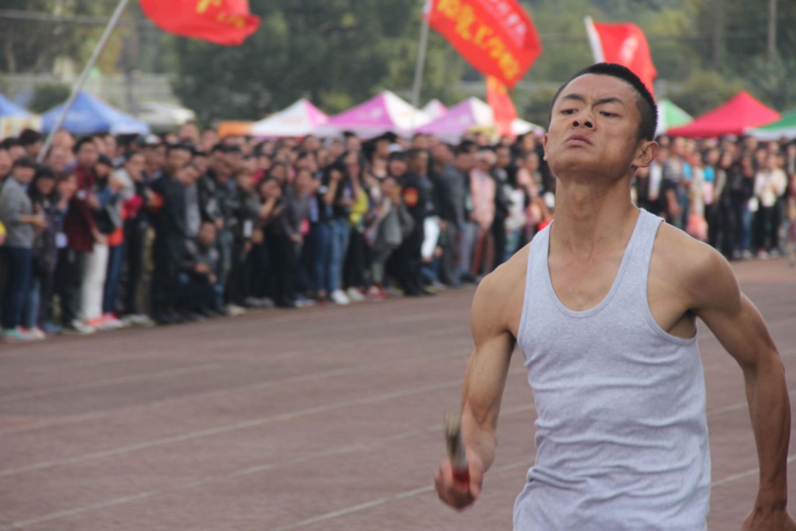 在比赛进行到如火如荼的紧张时刻,本来居于领先的一名运动员不慎摔倒,在他摔倒的那一刻,在场的观众都发出了一声叹息,整个赛场瞬间屏神凝息。当观众们都认为这组一定会落后时,捡起掉落在跑道上的接力棒,并迅速地传给了下一名运动员。这种“不抛弃,不放弃”的体育精神深深地打动了在场的每一个人。结果永远都不是最重要的,奥林匹克精神永驻心间才是校运会真正的意义所在。