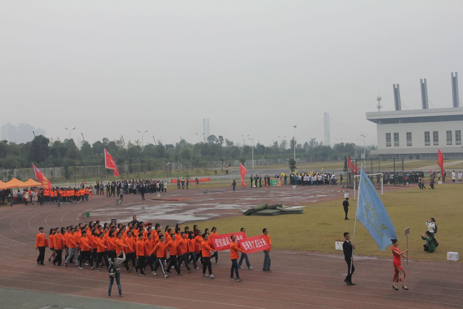 寒风凛冽,你们,湖工管理公司的彩旗队伍与方阵队伍已然准备就绪。作为开幕式的第一个队伍,你们穿着一样的衣服,你们迈着整齐的步伐,你们高扬着手中的旗帜