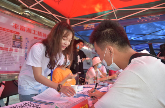 门口的工作者在岗位上尽职尽责,新来的同学也积极配合相关工作。由于疫情的原因,陪同的家长不能进入公司,望着自己满是行李的孩子在志愿者的帮助下进行报道,他们也多了一份安心。坚守在工作棚下的员工工作者们,耐心的回答新生的问题,即便工作非常忙碌,也尽心地引导他们完成报道工作。身负杂重行李的新生,在志愿者的帮助下,减少的不仅仅是身体上的负担,更是减少了第一次一个人进入大学的茫然与无措,感受到了管理公司大家庭的温暖。