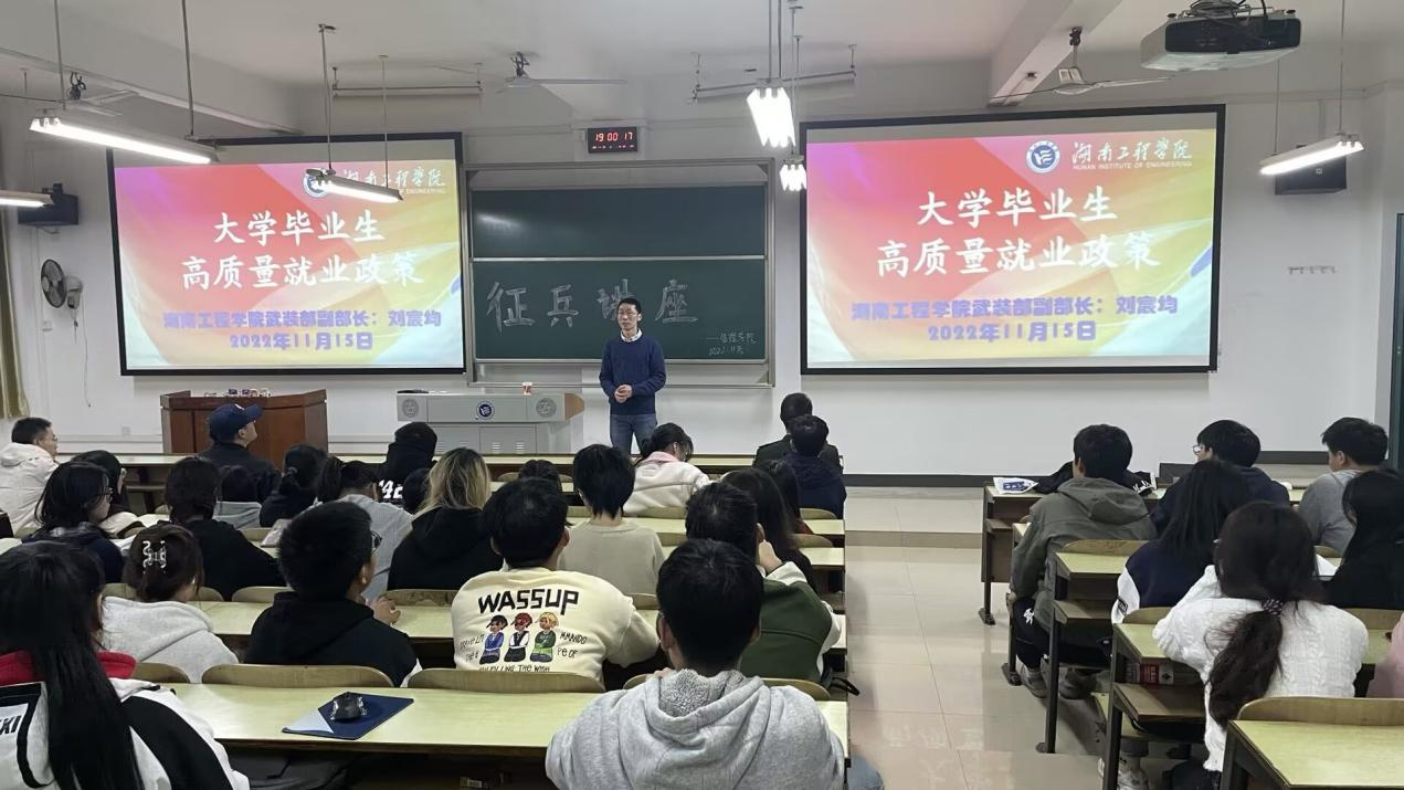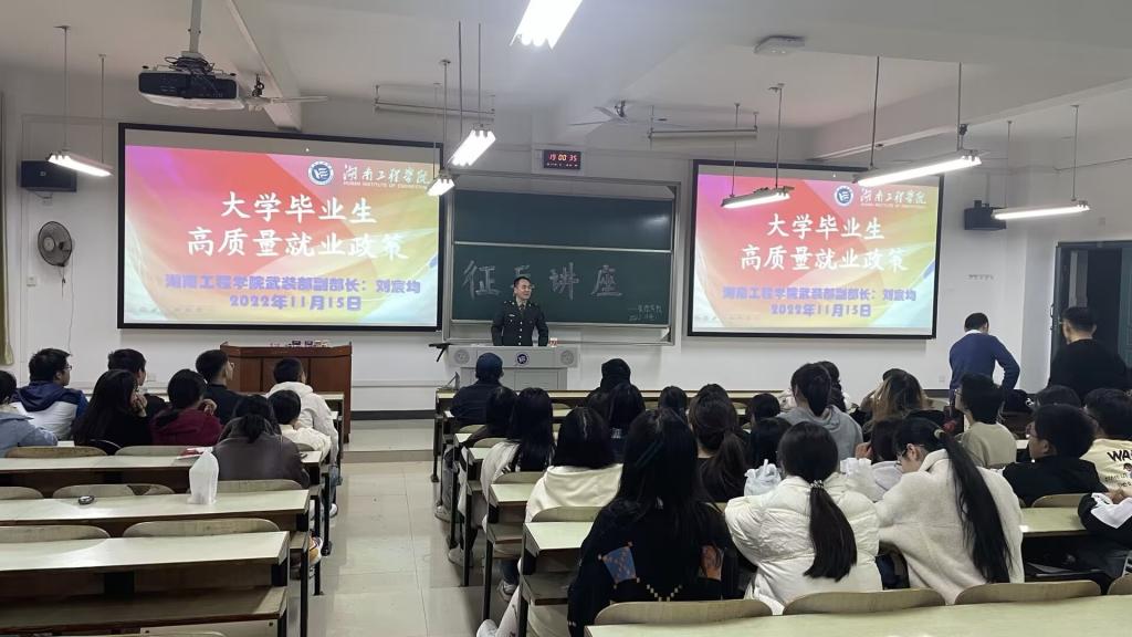 讲座期间,刘老师主要讲述当前国家对老员工参军入伍的优惠政策,并通过入伍故事分享、就业形势分析、考公考研政策优惠等方面让同学们能最直观感受到最新政策对其人生的影响。刘老师生动形象地将选择部队比作一场旅行,旅途中不仅身体素质能明显提高,而且在人际交往、抗压能力、知识眼界等方面都将焕然一新。他表示:收获的不单是沿途的风景,更是人生道路上无价的财富,选择一场军旅,无悔于青春韶华。