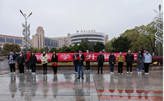 徐运保作国旗下的讲话。他对广大学子提出三点要求:一是与党同心,跟党奋斗;二是刻苦研习,开拓创新;三是心怀家国,勇敢追梦。希望同学们以砥砺奋进之初心、只争朝夕之勇行,在奋进新征程中展现湖工管院学子的青春风采。