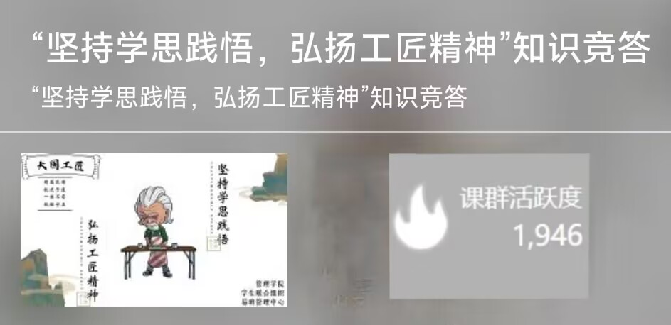 5月5日至7日,以易班APP为载体,搭建“青春不朽”主题平台,通过视频和文字相辅相成的形式介绍先辈们为革命付出的青春与热血,并以签名墙的形式呈现同学们的满腔热情。漫漫征途,学无止境。与此同时,公司还开展了“坚持学思践悟,弘扬工匠精神”线上知识竞答活动,后台数据显示,共有1946人参与作答,合格率为82%。管院广大学子以先学后答的谨慎态度为本次活动交上一份满意的答卷。