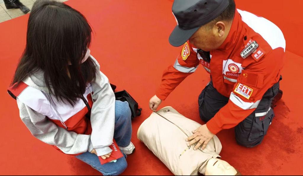 红十字教授向志愿者展示急救技能